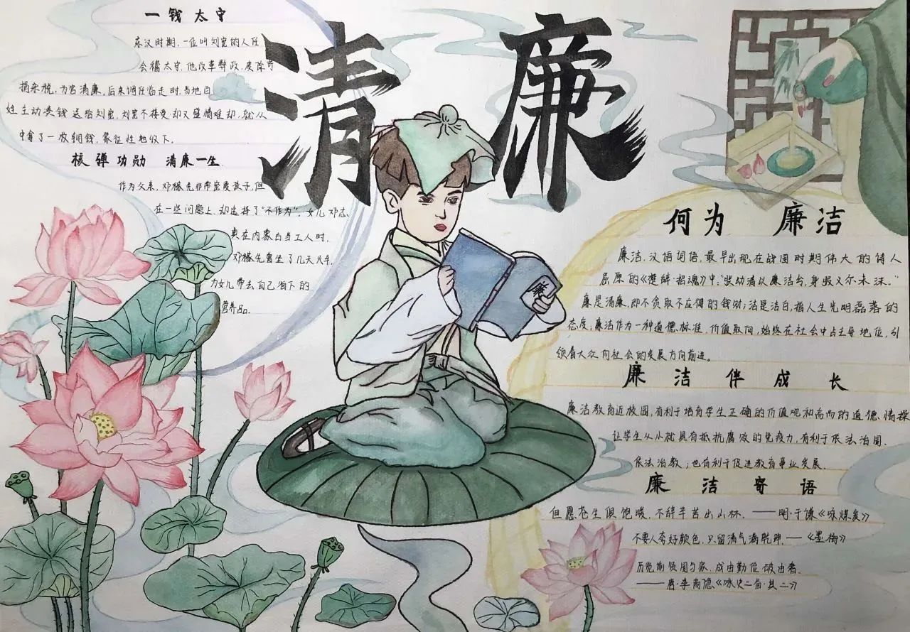 此次活动将手抄报制作与廉洁文化融入到同学们的学习生活中,同学们通过发挥自己的创造力和想象力,在作品形式、图文色彩、构思布局等方面充分展现了自己独特的审美和创意。作为新时代的青年,我们应将“廉”的种子在心中播撒,争做清廉文化建设的参与者与传承者,一同携手,让廉洁之风吹满校园。