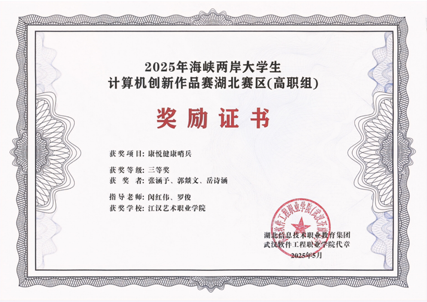 2025年5月22日在武汉软件工程职业学院举办的《2025年海峡两岸暨港澳地区大学生计算机创新作品赛湖北赛区选拔赛》,我校管理学院软件技术专业学生参赛作品《康悦健康哨兵-基于HarmonyOS赋能的全场景应用》与省内兄弟院校同台竞技喜获三等奖,参赛学生:张涵予、郭燚文、岳诗涵,指导教师:闵红伟、罗俊,这也是我校软件技术专业首次参与该赛事并一举获奖。