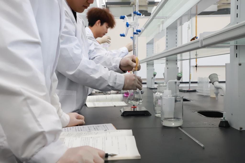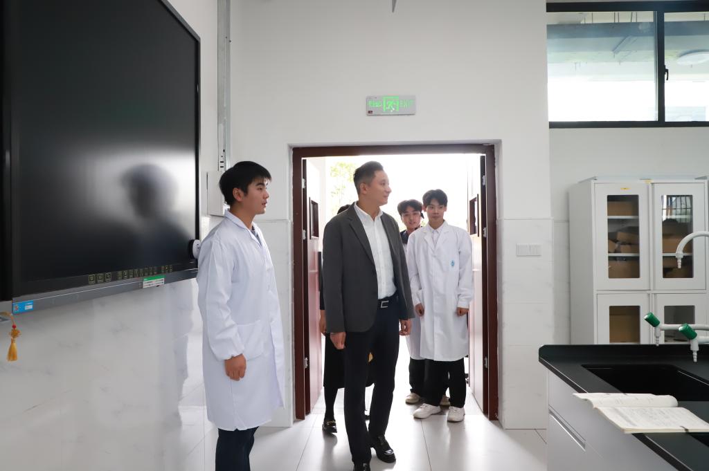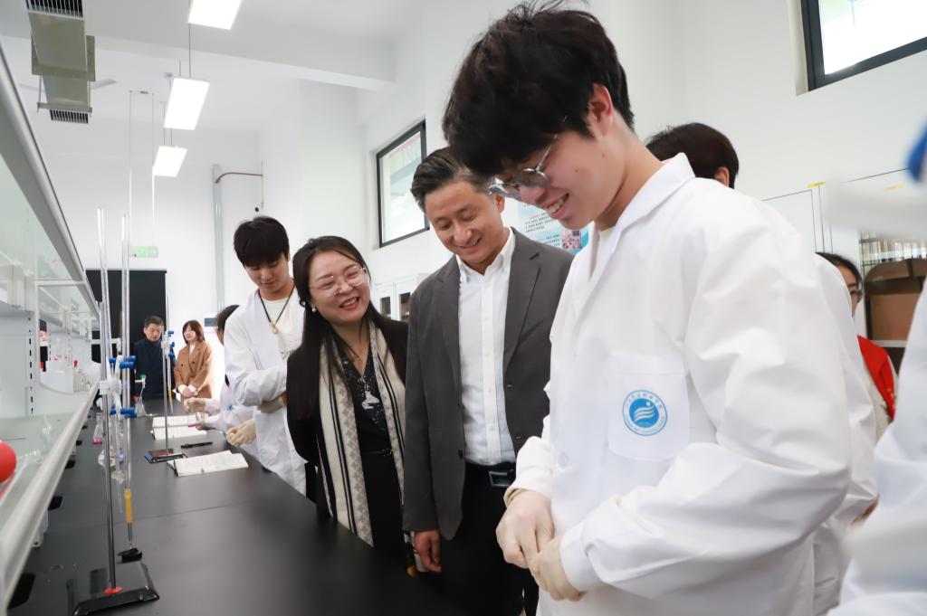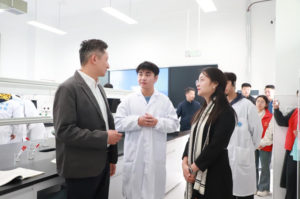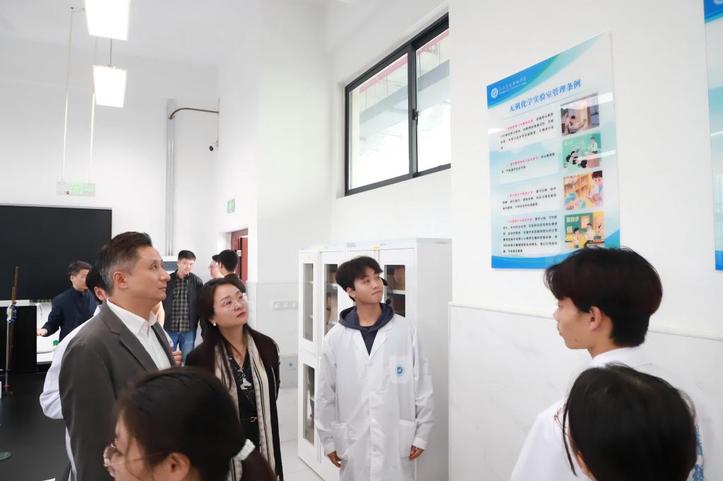 应用化工技术专业许忠林、王杰同学详细讲解实验室的布局与功能。张灿副处长对学生的实验操作提出指导建议,并询问了学生的课程衔接情况、专业认知及未来规划。