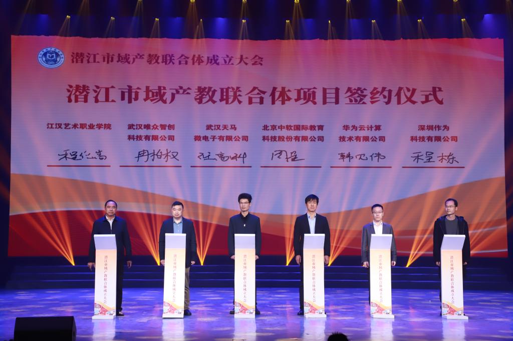参观结束后,各领导移步风华剧场参加潜江市域产教联合体成立大会。会上,武汉唯众智创科技有限公司、北京中软国际教育科技股份有限公司、华为云计算技术有限公司、潜江永安药业股份有限公司、武汉天马微电子有限公司、金澳科技(湖北)化工有限公司与我院现场签约,达成深度合作意向。