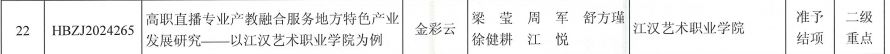 2. 课题编号HBZJ2024265《高职直播专业产教融合服务地方特色产业发展研究——以江汉艺术职业学院为例》(负责人:金彩云),成功结项并获评二级重点课题;
