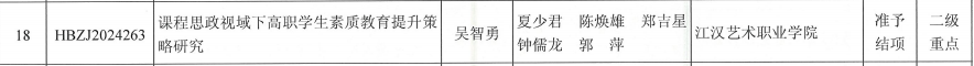 1. 课题编号HBZJ2024263《课程思政视域下高职学生素质教育提升策略研究》(负责人:吴智勇),成功结项并获评二级重点课题;